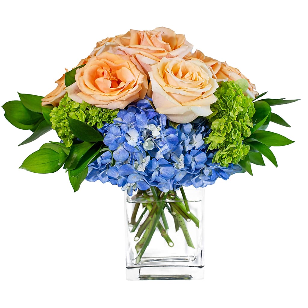 Simply stated - sweet! Apricot Preserves will spread cheer. Peach Roses and blue Hydrangeas are artfully displayed in this cube vase.