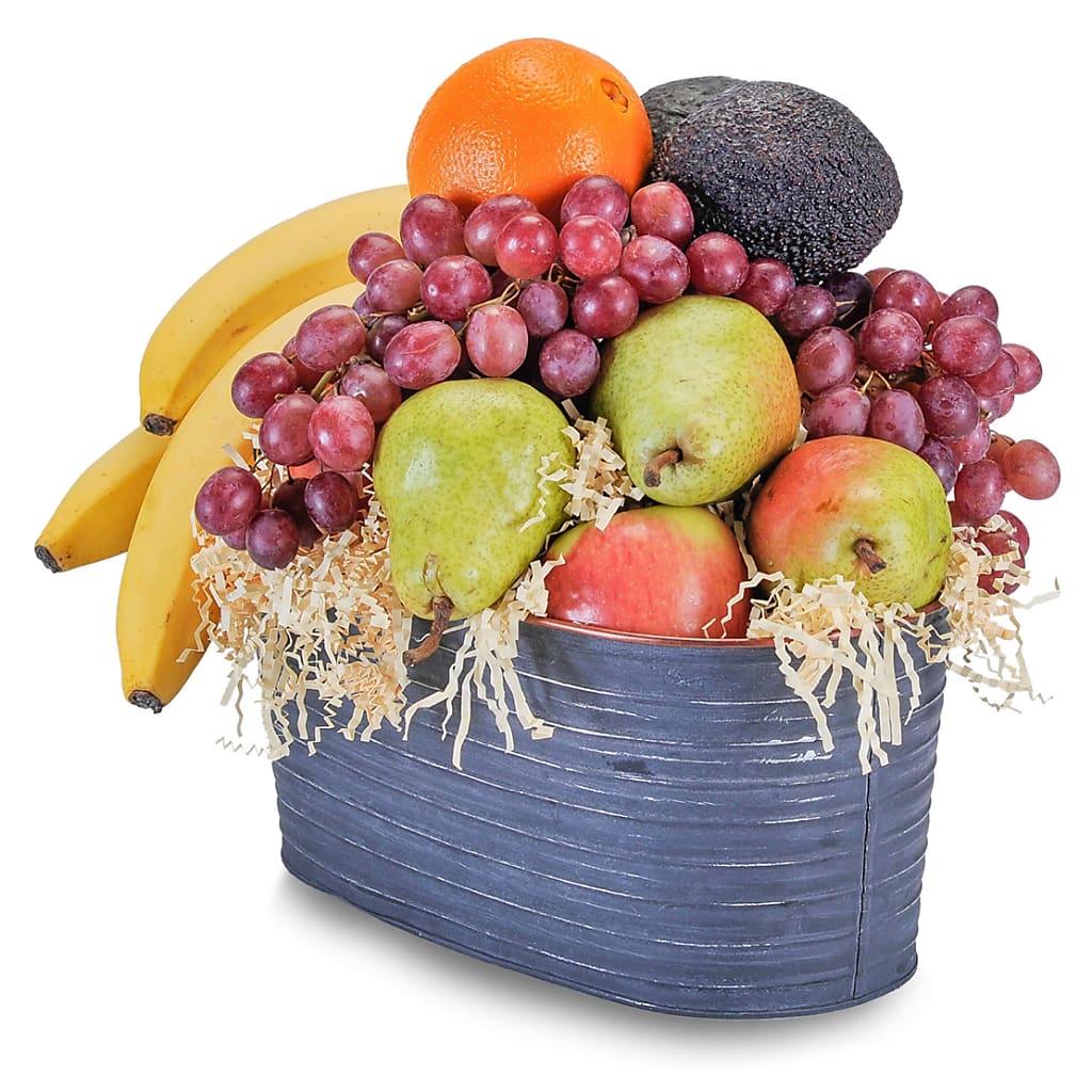 This combination of fresh and healthy fruit, including grapefruit, apples, oranges, pears and grapes, will make a delightful gift. Oranges, apples, pears, grapefruit and grapes in a specialty container or basket.