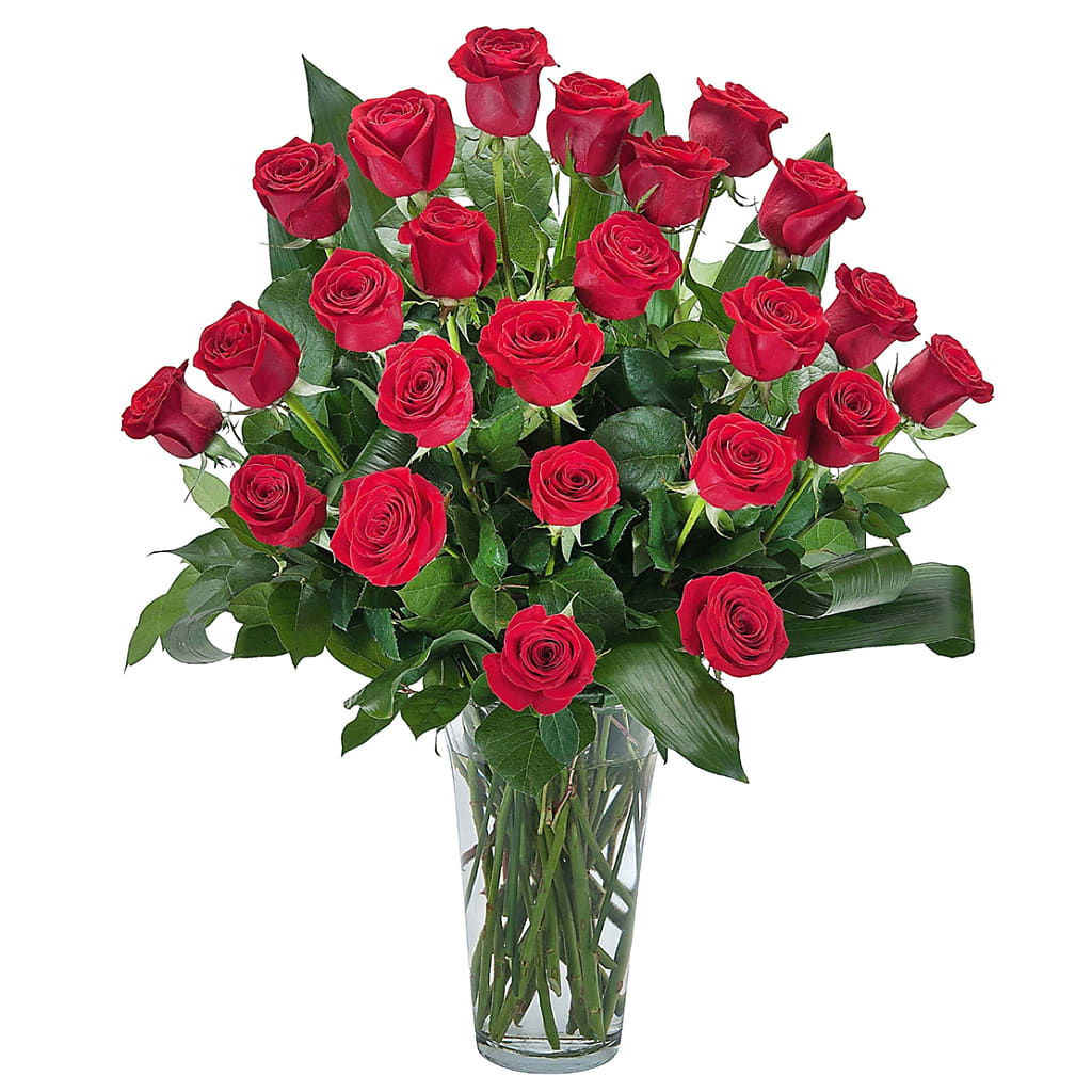 Two dozen premium roses designed with specialty foliage in a clear vase.