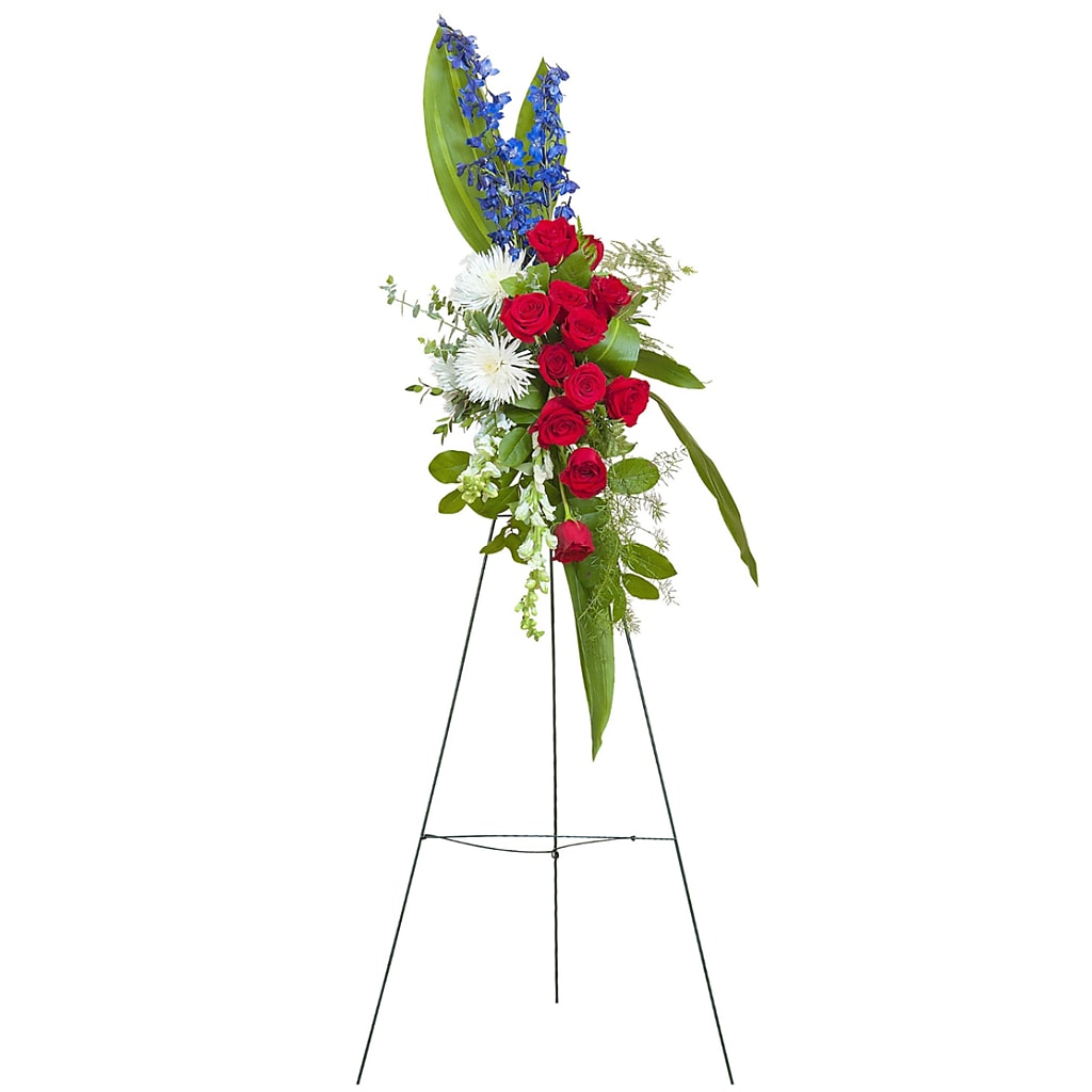 This standing spray is a honorable display of red, white, and blue blooms.