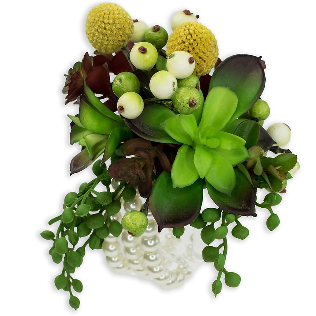 An organic mix of succulents, berries and blooms on a pearl bracelet for a unique wrist corsage.
