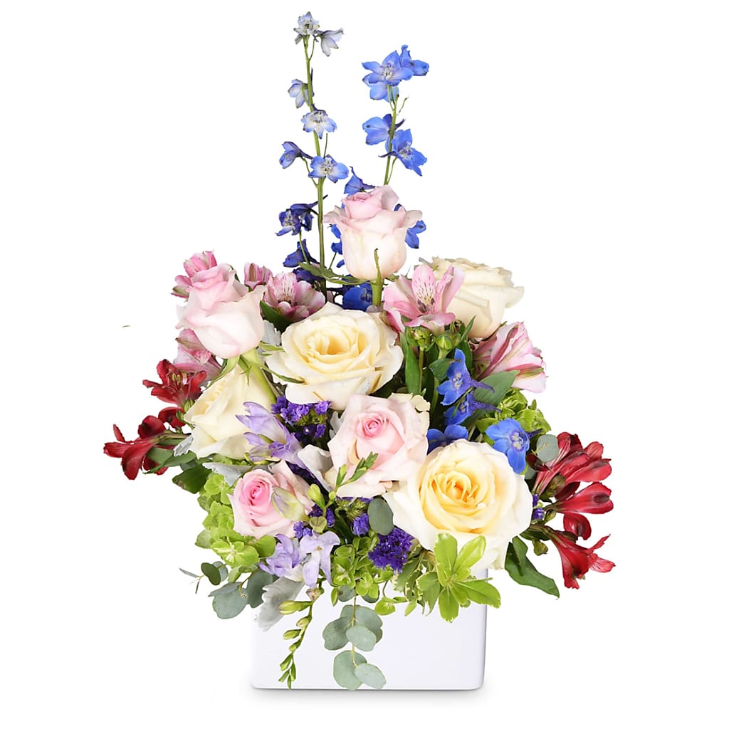 Our Best Life shows they are part of what makes life worth living. A white ceramic vase holds an abundance of roses, freesia, blue delphinium, and more letting that special someone know they are loved and appreciated.