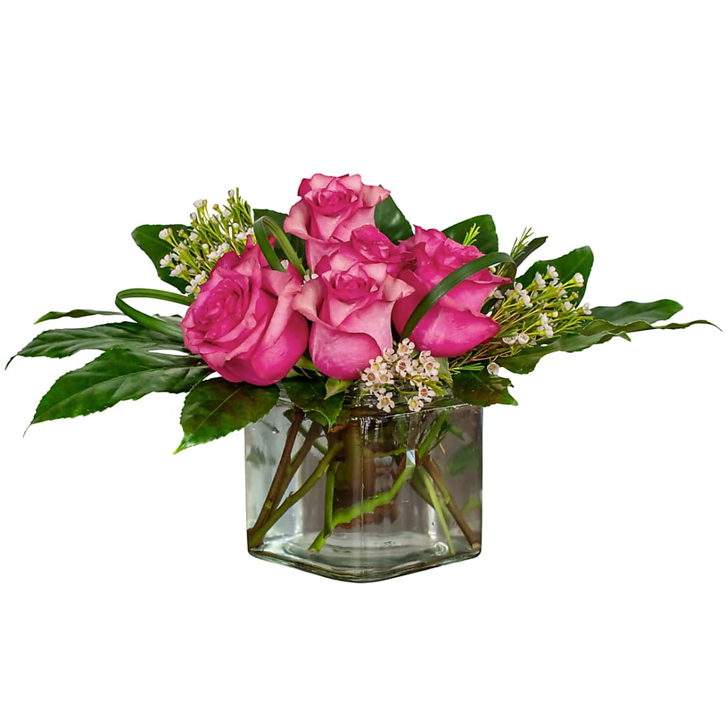 Sleek and stylish. Passionate Pink sends a special message of affection. Flowers like hot pink roses are tastefully arranged in this cube will accent any space.
