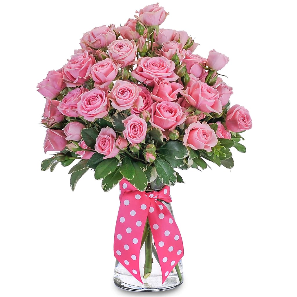 This design of pink spray roses is overflowing with beauty and accented with ribbon, will bring a twinkle to her eye when it arrives! Pink Spray roses in a clear glass vase accented with premium foliage.
