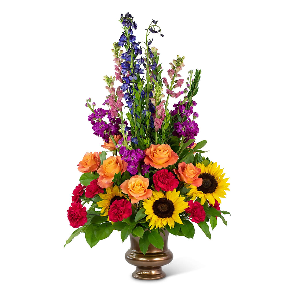 Celebrate vivid memories with The Prismatic Rays Tribute. Carnations, Snapdragons, Stock, Delphinium, Sunflowers and Roses convey your wishes of sympathy and comfort to the grieving family.