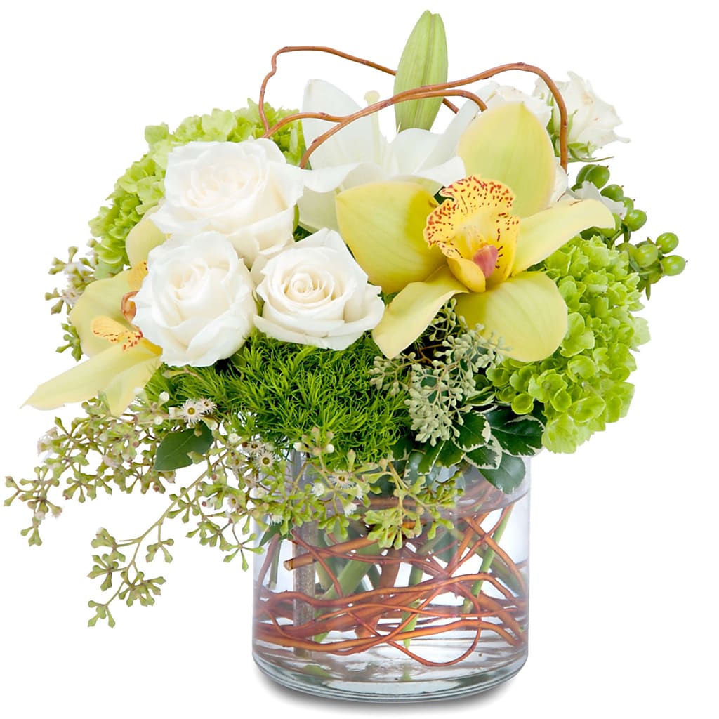 A crisp clean combination of lilies, roses, orchids and hydrangea in a clear vase accented with Curly willow give the message of a renewed promise.