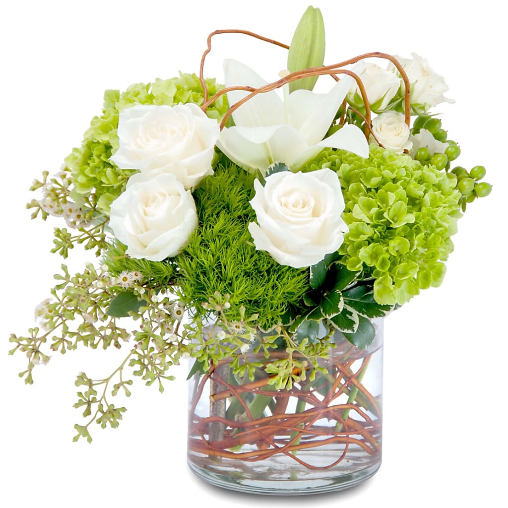 A naturally beautiful combination of lilies, roses and hydrangea in a clear vase accented with Curly willow to make this simply styled design.