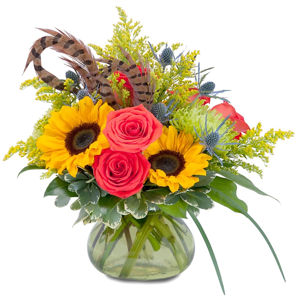 Bright but warm harvest colors of sunflowers, roses and accent flowers combine in this design to bring a bit of sunrise bounty.