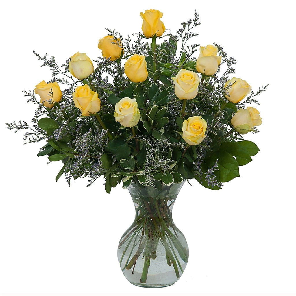 Beautiful Yellow Roses designed with an accent flower in a clear glass vase.