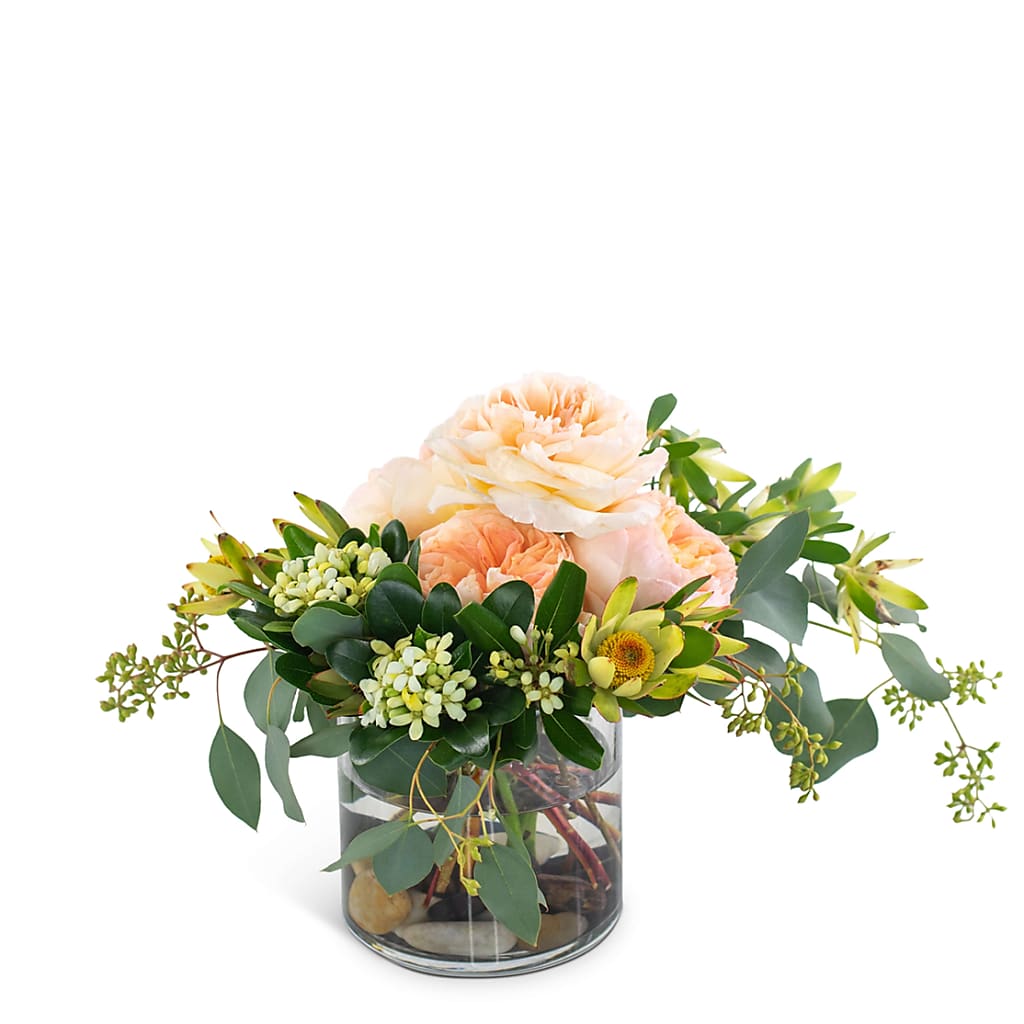 Oh, darling, You're a Peach! Send this beautiful gift of flowers, You're a Peach, an arrangement overflowing with garden roses, Leucadendron seeded eucalyptus, and stones underwater to that special peach in your life.
